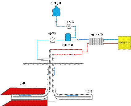 基于水平分支井的封闭循环取热技术,如图2所示,利用多分支水平井技术,在主井眼上钻多个水平分支井眼,换热流体从主井眼进入,然后扩展到各分支水平井眼,流体在水平分支井眼中流动时,吸收热量,然后从绝热内管返回地面,随后进入换热器,经对流换热加热地面循环流体。最终,释放出热量的载热流体在循环泵的作用下进入主井眼,构成封闭循环系统。