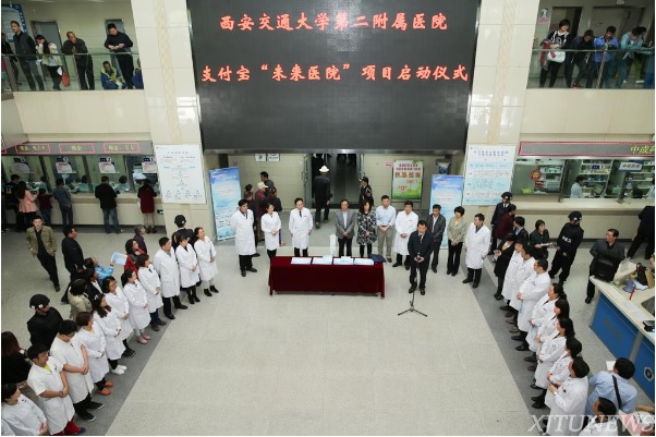 21日下午2时,在交大二附院医疗门诊综合大楼大厅正式举行了“未来医院”计划启动仪式。陕西省卫计委副主任黄立勋、西安交通大学副校长颜虹、陕西省卫计委电子数据中心主任虢玲霞、支付宝公共服务事业部总经理邹亮,以及第四军医大学西京医院、唐都医院、口腔医院,陕西省人民医院,西北妇女儿童医院,西安交大第一附属医院和西安交大口腔医院等兄弟单位领导莅临祝贺,交大二附院部分院领导及相关部门负责人及工作人员参加了启动仪式。启动仪式由交大二附院副院长高亚主持,省卫计委副主任黄立勋、西安交大二附院院长贺西京、支付宝网络技术有限公司公共服务事业部总经理邹亮先后致辞。中央电视台、陕西电视台、西安电视台以及陕西日报、三秦都市报、华商报、华商网、西安日报、阳光报、健康时报等三十多家新闻媒体到会采访。