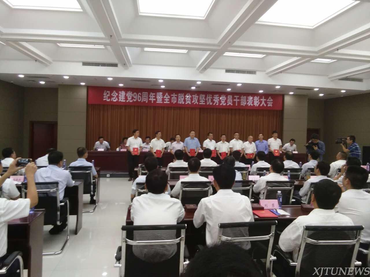 同日上午,平利县庆祝中国共产党成立九十六周年会议召开,会议由平利县县长陈伦富主持。大会对在脱贫攻坚工作中的先进集体和先进个人进行了表彰,西安交大扶贫团正阳镇南溪河村优秀“第一书记”梁维进、八仙镇仁溪沟村优秀“第一书记”杨爱等两位优秀驻村“第一书记”受到表彰。平利县委书记郑小东为其颁奖,并鼓励他俩继续发扬交大精神,为平利县全面实现小康,建设中国最美乡村作贡献。