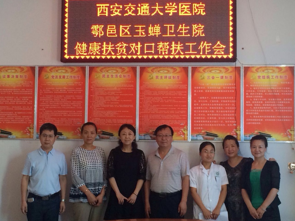 为贯彻落实《中共中央关于打赢脱贫攻坚战的决定》,同时认真落实《西安市卫生和计划生育委员会关于印发全市二级以上医院对口帮扶涉贫区县乡镇卫生院工作方案的通知》文件精神, 7月7日上午,西安交通大学医院徐蕾副院长、党总支书记代晓勇、办公室副主任文华、护理部主任金晓艳等一行7人到户县玉蝉卫生院进行实地调研及双方签约工作。