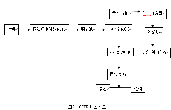 该领域最常见的就是CSTR工艺,即连续搅拌反应器系统(Continuous stirred tank reactor),其原理是在一个密闭罐体内完成料液的发酵、沼气产生的过程。反应器内安装有搅拌装置,使发酵原料和微生物处于完全混合状态。投料方式采用恒温连续投料或半连续投料运行。新进入的原料由于搅拌作用很快与反应器内的全部发酵液菌种混合,使发酵底物浓度始终保持相对较低状态。图2为CSTR工艺流程图。