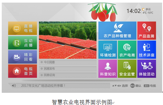 智慧农业平台可以在有线电视平台上推送农业现代化发展相关的信息,并与手机、电子大屏实现互联互通。平台具体栏目内容可包括农产品种植管理、产品追溯、环境检测、农产电商、技术讲座、科普知识、安全监管和体验活动等。