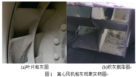 在离心风机的许多应用场合都会遇到叶轮积灰问题,比如在水泥、炼钢以及化工等行业。叶轮积灰粘附容易破坏叶轮的动平衡,引起风机的剧烈振动,甚至损坏轴承,给用户造成较大的损失。由于叶轮积灰粘附的原因,使得风机需要更换叶轮甚至更换整机的例子也不在少数,如某公司生产的风机,叶轮粉尘粘附非常严重,风机运行3小时左右就会出现剧烈的振动,停机清洁粘附的粉尘后,再次运行3小时左右又会出现剧烈的振动,严重影响了用户的正常生产。最后只好更换了风机,才勉强解决了叶轮的粘附问题,但是大幅降低了风机的效率。