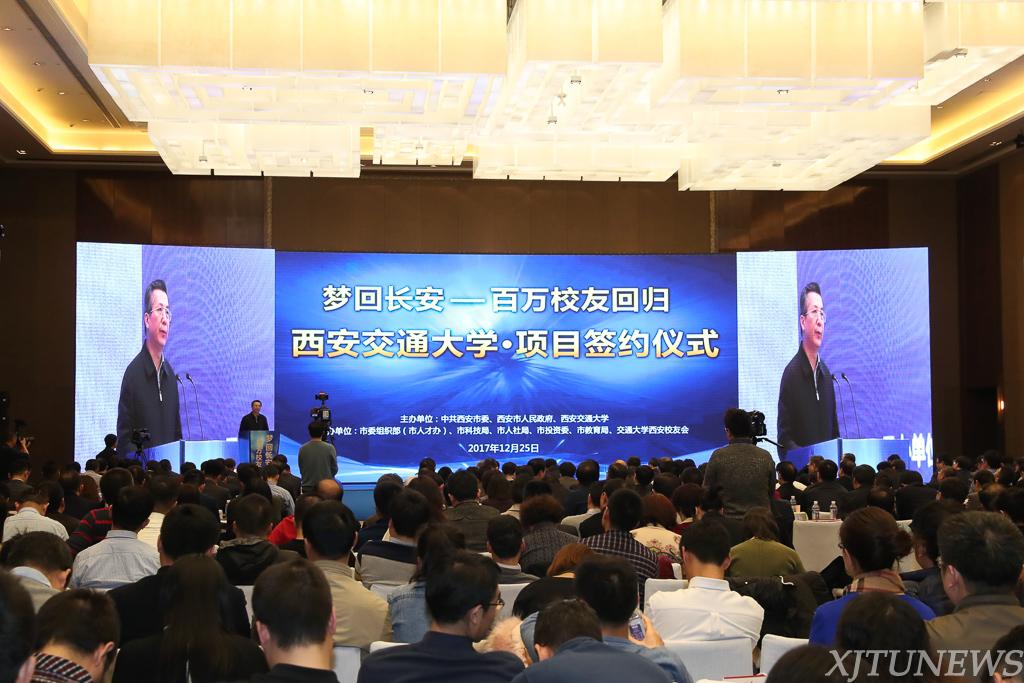 12月25日下午,“梦回长安——百万校友回归”西安交通大学专场活动在曲江新区举行。陕西省委常委、西安市委书记王永康,西安市委副书记、市长上官吉庆,陕西省人大常委会副主任、西安交通大学党委书记张迈曾,西安交通大学校长王树国、党委常务副书记王小力、副校长席光,中国工程院院士卢秉恒教授、中国科学院院士徐宗本教授等出席活动。200多位来自各地的西安交通大学校友回归母校,共同感受大西安“诚聚天下英才”的热情。西安市委常委、常务副市长吕健主持校友项目签约仪式,总签约金额超过1200亿元。