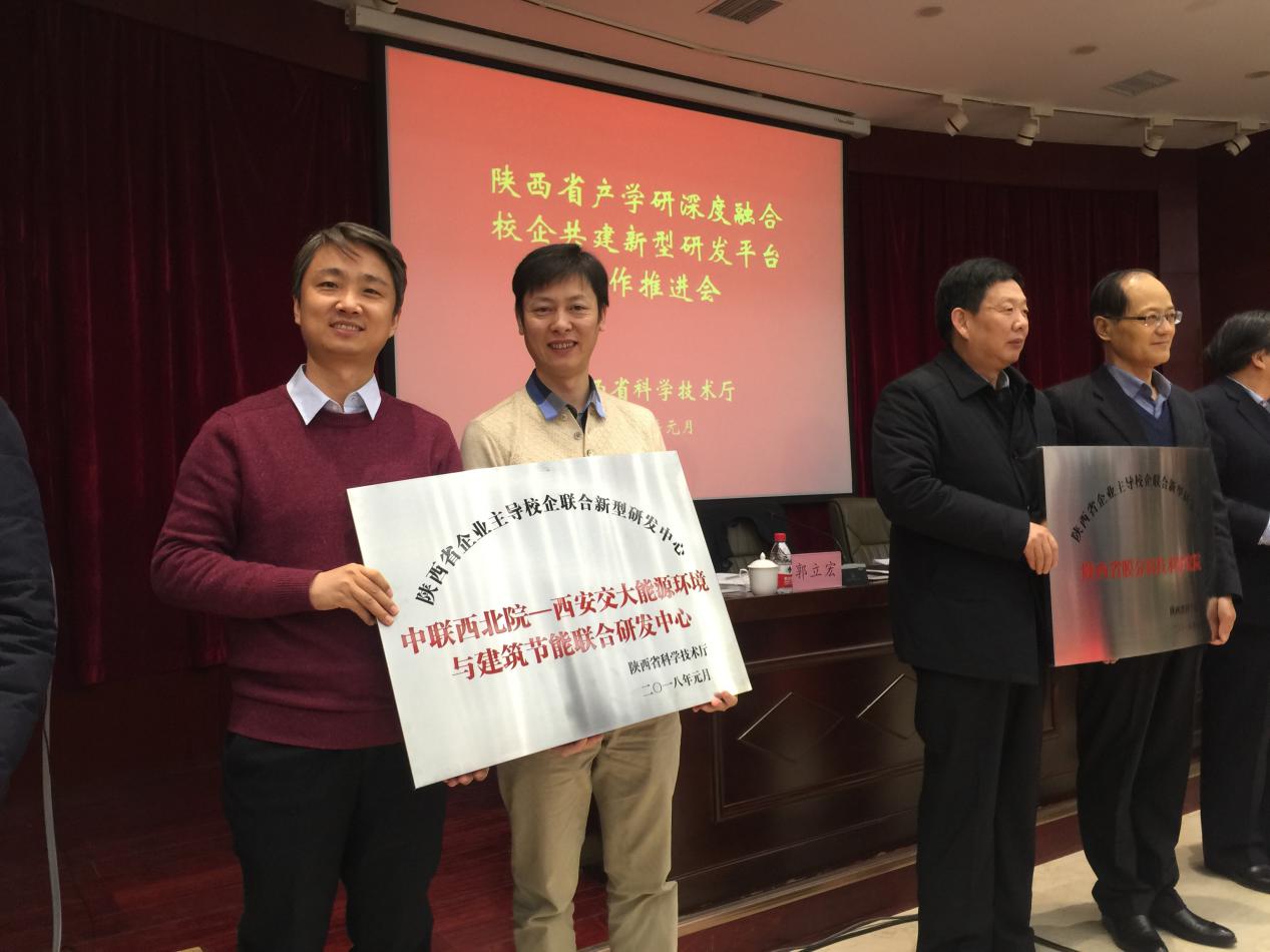 “四主体一联合”研发平台是陕西省科技厅深化校企合作和科技成果转化应用的重要举措,由企业作为需求主体、投资主体、管理主体和市场主体,并与高校和科研院所联合成立。由西安交大人居学院牵头与中联西北工程设计院共同成立的“陕西省能源环境与建筑节能工程技术研究中心”是陕西筹建的首个“四主体一联合”研发平台,在双方多年合作的基础上于2016年筹建并于2017年12月通过陕西省科技厅组织验收批复正式组建。
