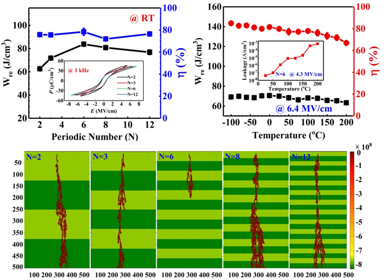 近日,西安交通大学贾春林科学家工作室通过选取同一体系不同组分的BaZr0.15Ti0.85O3和BaZr0.35Ti0.65O3材料,利用射频磁控溅射技术生长出了具有高能量存储密度的BaZr0.15Ti0.85O3//BaZr0.35Ti0.65O3多层膜。通过改变BaZr0.15Ti0.85O3//BaZr0.35Ti0.65O3多层膜的周期数即提高界面数,使界面作为电树枝发展阻碍的方式,提高了外延BaZr0.15Ti0.85O3//BaZr0.35Ti0.65O3多层膜的击穿场强,并在周期数为6时获得了优异的储能密度。同时在-100oC~200oC温区内,该多层薄膜表现出优异的宽温稳定性。该项研究结果对优化多层膜的界面数来提高铁电薄膜的储能特性具有指导性意义。