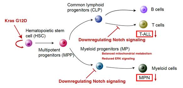 近日,西安交大第二附属医院生物诊断治疗国家地方联合工程研究中心孔光耀教授研究发现,与急性髓系白血病不同,Notch信号通路在骨髓增殖性肿瘤中主要发挥癌基因的作用。研究者利用基因敲入和基因敲除小鼠,在Kras突变体诱导的白血病小鼠模型中抑制Notch信号通路,发现下调制Notch信号通路后,小鼠骨髓增殖性肿瘤的发病率显著降低,同时小鼠的生存期显著延长。进一步的机制研究发现,抑制Notch信号通路可以上调ERK信号通路负调节因子DUSP1,进而抑制ERK信号通路的激活。研究还发现,抑制Notch信号通路可以抑制白血病细胞的氧化磷酸化。更重要的是,同时抑制ERK信号通路和氧化磷酸化对白血病细胞具有更好的靶向杀伤作用,这可能是一种骨髓增殖性肿瘤的潜在靶向治疗策略。