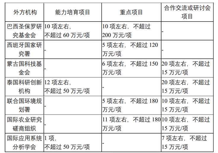 “能力培育项目”旨在支持中外科研人员培育合作关系,可开展包括合作研究、野外考察等多种形式的研究活动。“重点项目”旨在资助中外科研人员在选定领域开展合作研究,共同培养杰出科技人才和解决区域性科学问题,促进提升地区的科研水平与世界影响力。“合作交流项目”旨在支持中外科研人员开展能力建设,可开展包括互访、讲习/培训班等多种交流活动。“研讨会项目”旨在支持中外科研人员召开在华会议及出国会议。