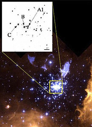 银河系NGC 3603中人类所知的最大恒星A1位于另外两个巨大的佛耳夫—拉叶星旁,编号分别为B和C