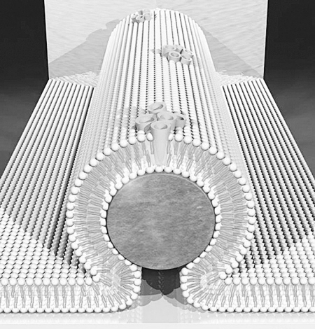 中间圆形的为硅纳米线,上面覆盖的是脂质双层薄膜,薄膜内零星分布着孔隙通道